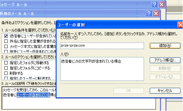 ここでは、『送信者にユーザーが含まれている場合』のチェックを入れて、ユーザーの選択で、送られてくるメールのメールアドレスの一部を入力して『追加』ボタンを押します。 ※指定するユーザーは、フルネームでなくてもOKです。名前の一部分が入っていればよいです。 ルールの作成は、いろいろルールを作成できるので自分の思うようなルールが作成できます。