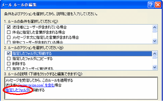 次に、移動先となるフォルダの指定です。 『指定したフォルダに移動する』にチェックを入れます。 すると、『新たに指定したフォルダに移動する』が追加されるので、下の図の赤丸の場所をクリックします。