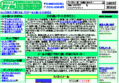 しかし、検索エンジンにHITした場合に表示されるのは、フレームを定義したHTMLファイルではなくフレーム内のページになってしまう場合が多いという欠点があります。お父さんの場合はちょっと面倒ですが、フレーム無しにしています。『お小遣いサイト』の多くはフレーム無しのサイトが多いです。どちらが良いか考えてサイト作りに励みましょう!サイトのレイアウトは後で変更するのはすごく大変です。サイトを作りこめば作りこんだ分、負担は大きくなってきます。