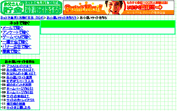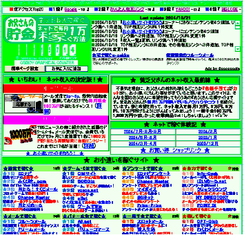 お父さんは、思い切ってお小遣いサイト『ネットで1万稼ぐ方法』としてサイトを独立して運用を開始することにしました。下図Aは、2004/10月頃のTOPページのレイアウトです。初期の頃と比べると決してデザインは良くなっているといえないかもしれませんが、ましには、なっていると思います。また項目ごとにメニュー形式でアクセスできるようにしているので操作性もアップしていると思います。もっとデザインをカッコ良くしたいのはやまやまなのですが、この辺りがお父さんの限界です。以前に比べてアクセス数がだいぶ増えました。