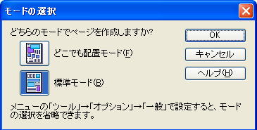 ホームページビルダーでは、新しいページを作成する時に下図のような選択画面が表示され、モード選択してホームページを作成することになります。