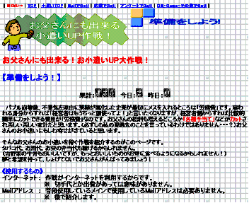 | いざ、お小遣いを稼ぐサイトをはじめたはよいが、世の中には満ち溢れんばかりのお小遣い系サイトが氾濫していました。素晴らしいサイトも多く、お父さんの貧弱なサイトのかなうところはないなーなんて少し弱気になってしまいました。しかし、お父さんの目的は、よそのお小遣い系みたく多く稼ぐことが目的ではありません。毎月、ほんのちょっと(1万円)だけ稼げればよいので、細々がんばってゆこうとサイトの構築に力を入れました。 まずは、検索エンジンにお父さんのサイトが引っかかるようにがんばるのが今月の目標です。検索エンジンに登録しまくってランキングサイトにも登録しまくりました。そして、相互リンクがGoogleのPageRankを上げる有効な手段だということも知り相互リンクのお願いもたくさんしました。はじめは、出来立てのサイトなんて相手にされないだろーなーなんて思っていましたが、お小遣い系のサイトの運営者の方は、非常に親切で、ほとんどの方が返事をくれました。中には、励ましの返事もくれ、お父さんのやる気に火がつきました。また、今月は、お父さんのサイトとほぼ同じ時期に立ち上げたサイト様とも相互リンクでき、ライバル意欲をもやし年末、コンテンツを急ピッチで増やしました。コンテンツを制作する時に、メールやゲームをすること、携帯電話を活用することによってもお小遣いを稼げることを知りました。早速、お父さんのサイトでも紹介することにしました。 あんなに、広報活動(検索エンジン登録、相互リンクのお願い)やったにもかかわらず。今月のお父さんの『ネットで毎月1万稼ぐ方法』の評価は、PageRank0でした。検索エンジンには引っかかるようになりましたが、これではお父さんのサイトになかなかアクセスしてもらえそうになりません。来月は、もっと積極的に相互リンクのお願いをしたり、広報活動をしようと思っています。 |